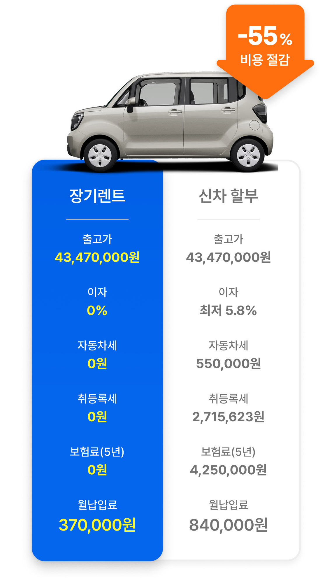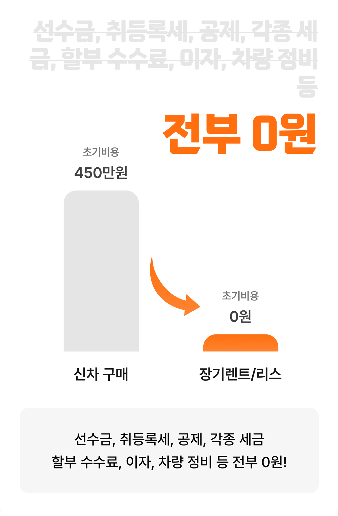 할부 : 차량 본인 소유, 금융이력 변동, 초기비용(취등록세, 자동차세, 탁송비 등) 발생, 보험 개별 가입